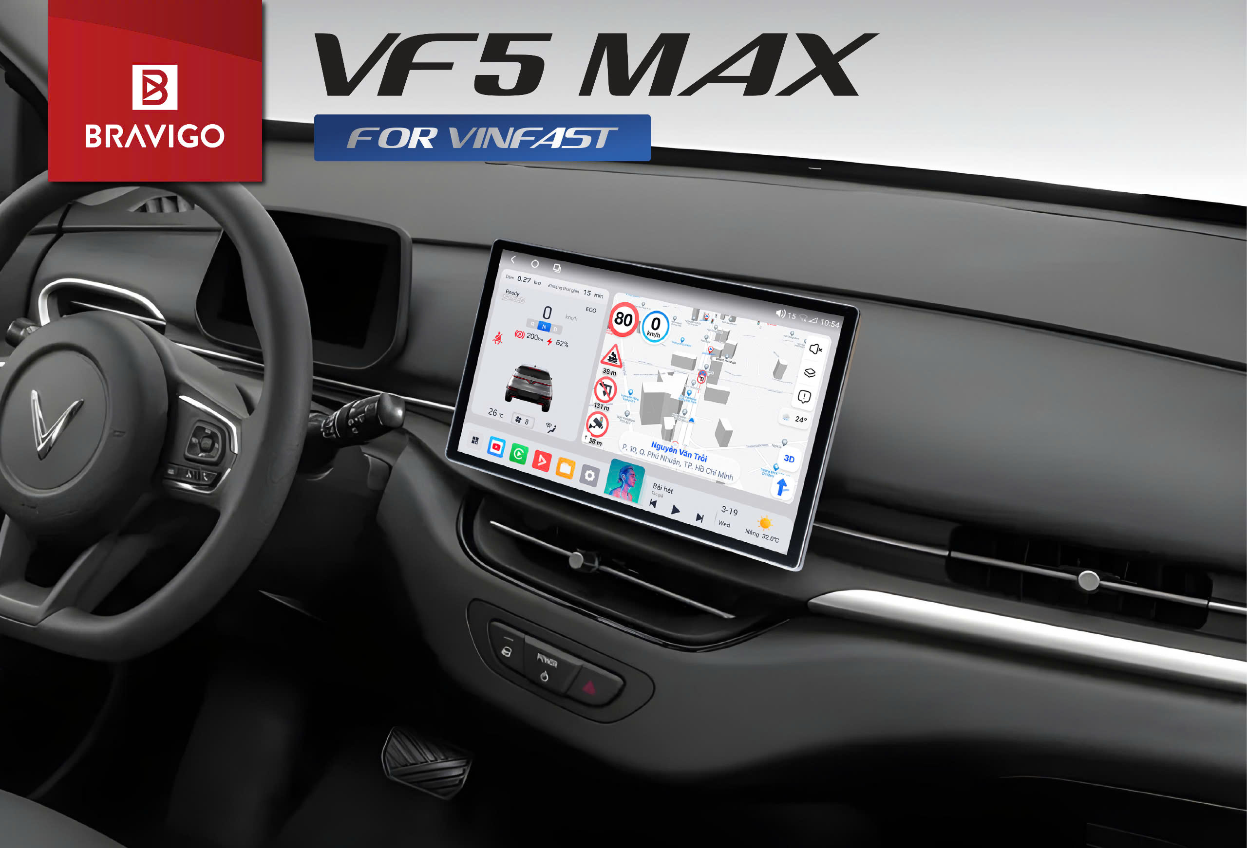 Khác biệt với các sản phẩm màn hình android lắp ngoài thông thường, Bravigo VF5 Max được phát triển và tối ưu riêng cho xe điện VF5 từ thiết kế phần cứng đến phần mềm. Với kích thước chuẩn 12.5 inch, sản phẩm vừa vặn với taplo xe, mang lại cảm giác sang trọng, đồng nhất và hiện đại cho không gian nội thất.